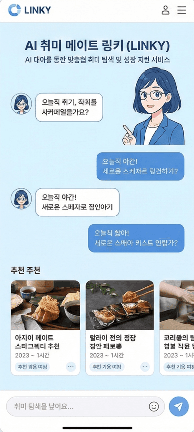 기존의 취미 서비스가 자발적 참여에 의존하여 지속성이 낮다는 한계를 극복하기 위해, 링키(Linky)가 탄생했습니다