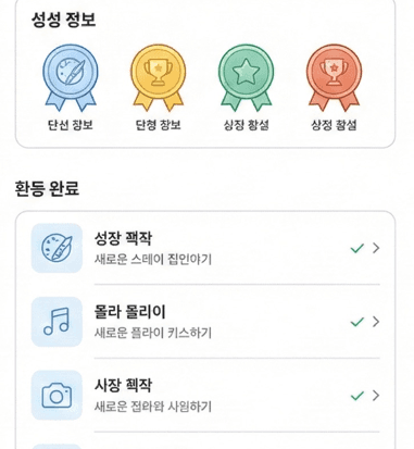 업적(성장) 부여 시스템: 취미 미션 수행이나 일일 과제 완료 등 특정 목표를 달성할 때마다 다양한 업적을 부여합니다. 이는 게임화 요소(Gamification)를 적용하여 취미 생활을 더욱 즐겁게 확장해 나갈 수 있도록 돕습니다.