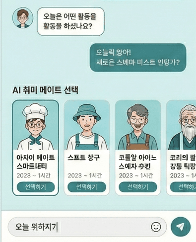 개인의 흥미와 취미 데이터를 분석하여 맞춤형 활동을 추천하고 , 새로운 취미를 발견하고 확장할 수 있도록 돕습니다. AI 캐릭터 챗을 통해 재미있게 미션을 수행하며 취미의 폭을 넓히고 정서적 만족도를 얻을 수 있습니다